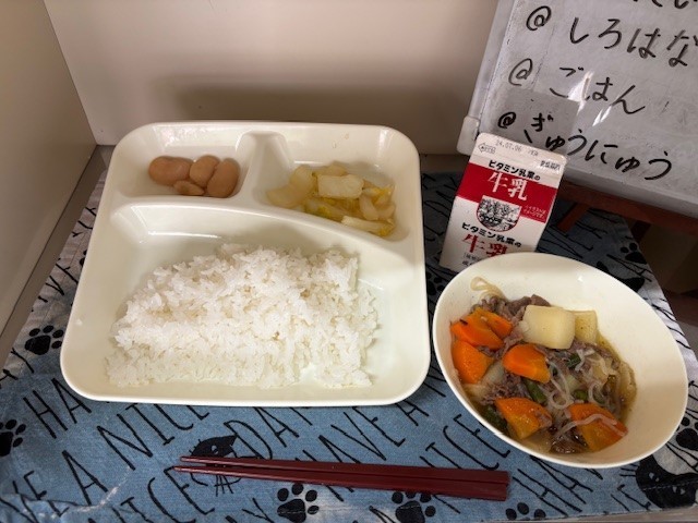 今日の給食は、「肉じゃが」「はくさいのゆず風味」「白花豆の煮もの」「ごはん」「牛乳」でした。白花豆は、べにばないんげんの仲間です。花も実も白いことから、白花豆と呼ばれるようになりました。豆には、たんぱく質や食物繊維が多く含まれています。苦手な児童も多いですが、1つぶは頑張って食べている様子が学級でみられました。肉じゃがは、大人気でほとんどのクラスが食缶空っぽでした。