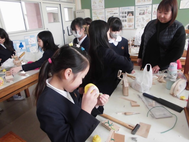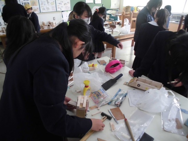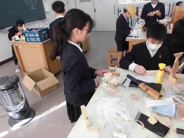 4年生が、図画工作で「きってたのしい きってつかえる」の学習をしました。木を自由に切って貼りつけて、様々な個性あふれた作品ができました。