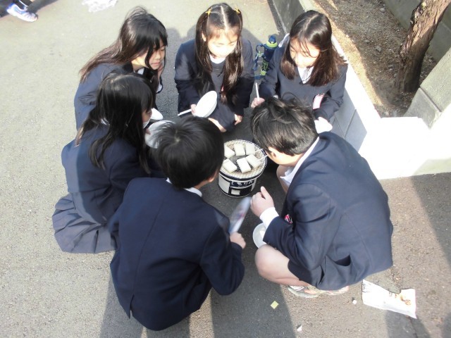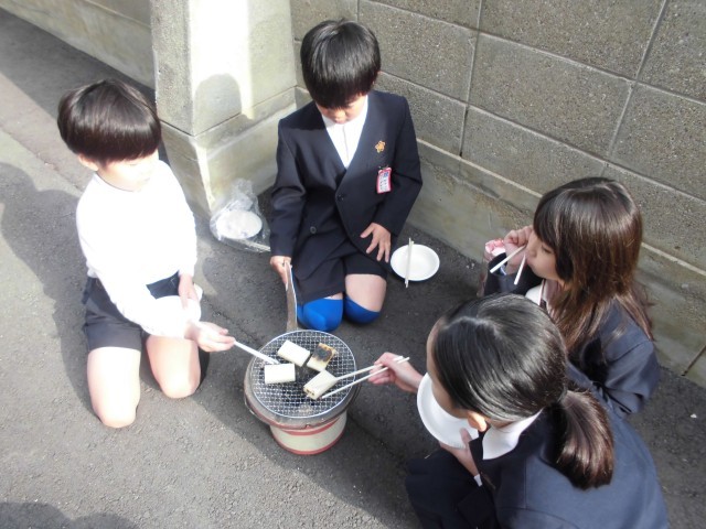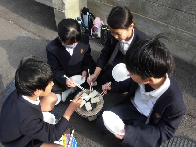 3年生が、社会で昔のくらしについて学習しています。今日は、昔体験として七輪でおもちを焼きました。みんなでおいしく食べました。