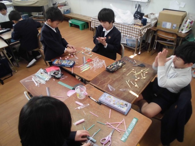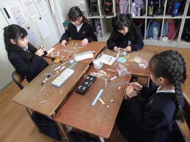 2年生が算数の学習で、今まで学習してきた「はこの形」を、ストローと粘土を使って作りました。みんなアドバイスしあったり手伝ったりしながら作り上げました。