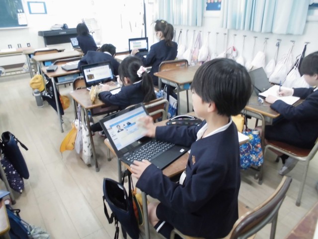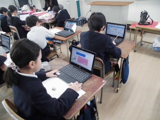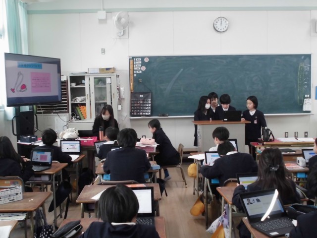 3年生が、社会で昔のくらしについて学習しています。9班に分かれてそれぞれの班が、昔の道具について調べ発表ノートでスライドを作りました。各班ごとの発表も今日が最後で、発表の良かったところなどの振返りをしました。