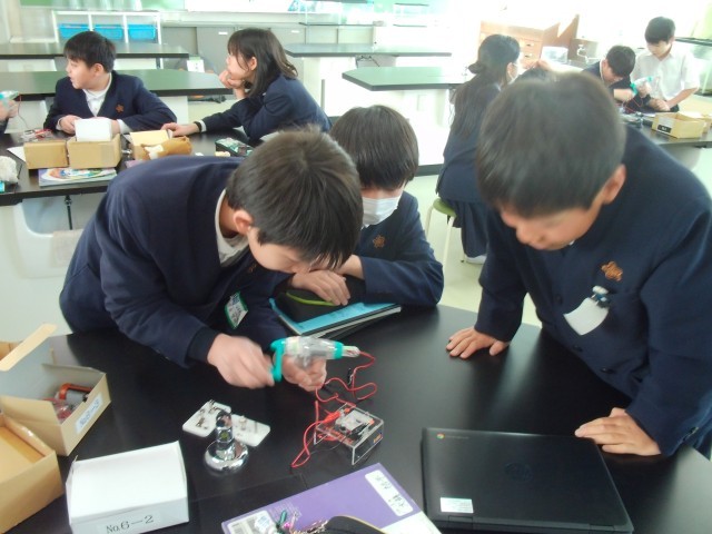 6年生が、理科でコンデンサーや手回し発電機を使って電気の利用について学習しました。初めに手回し発電機を使ってコンデンサーに電気をためました。その後、ためた電気で豆電球を点灯させました。どの班もみんなで協力して手際よく行うことができました。
