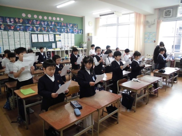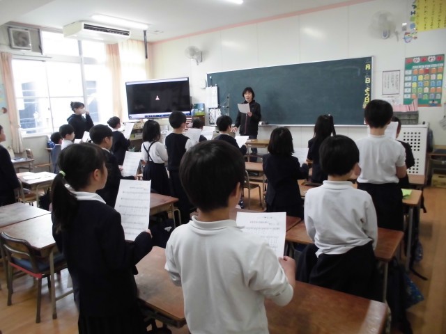 1年生が、入学式のお迎えの演技で歌う「ともだちになるために」の歌の練習をしました。新入生に素晴らしい歌を送ろうと頑張っていました。