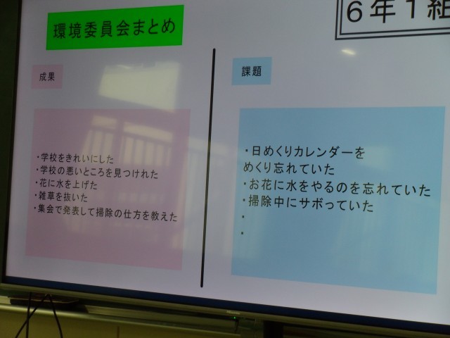 環境委員会は、各クラスごとに発表ノートにまとめて発表していました。次年度の委員会活動に向けてもしっかりメッセージを残していました。保健委員会は、木曜日の児童集会で発表する委員会発表のリハーサルをしっかり行いました。当日が楽しみです。また、自分たちの委員会活動の振り返りが終わった委員会は、来週行われる「卒業おめでとう集会」のそれぞれの委員会ごとの役割の準備について取り組んでいました。5年生を中心に「卒業おめでとう集会」に向けてみんなの気持ちも高まってきました。