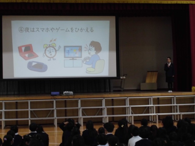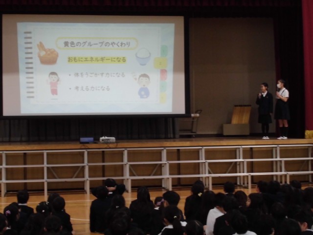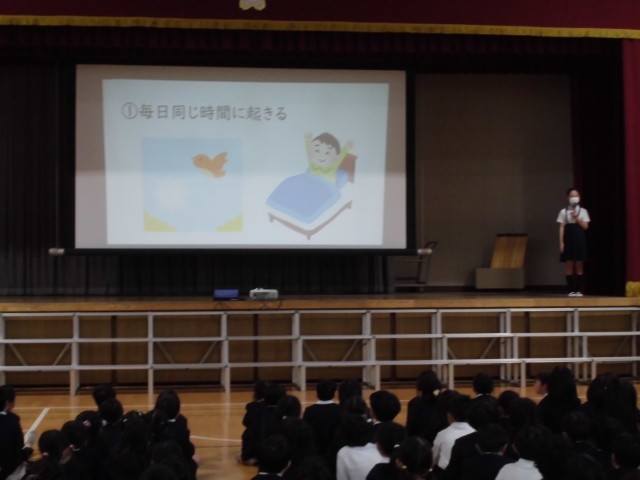 保健委員会が委員会発表をしました。テーマは睡眠です。学校保健委員会で、校医先生やPTAの方に見ていただいた発表を全校児童の前で改めて発表しました。アンケート結果や劇を通してわかりやすく伝えることができました。
