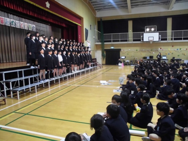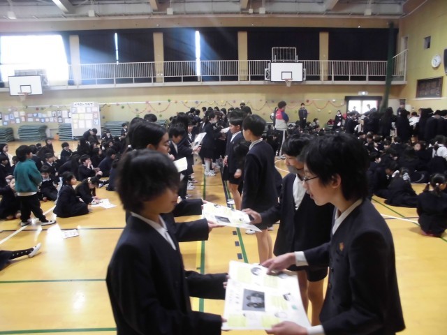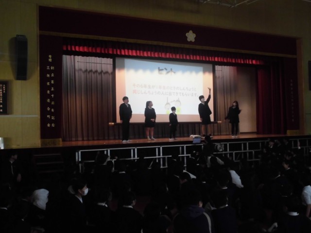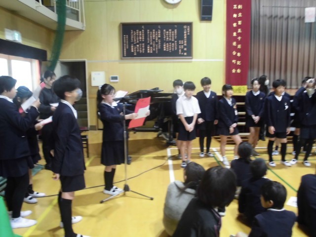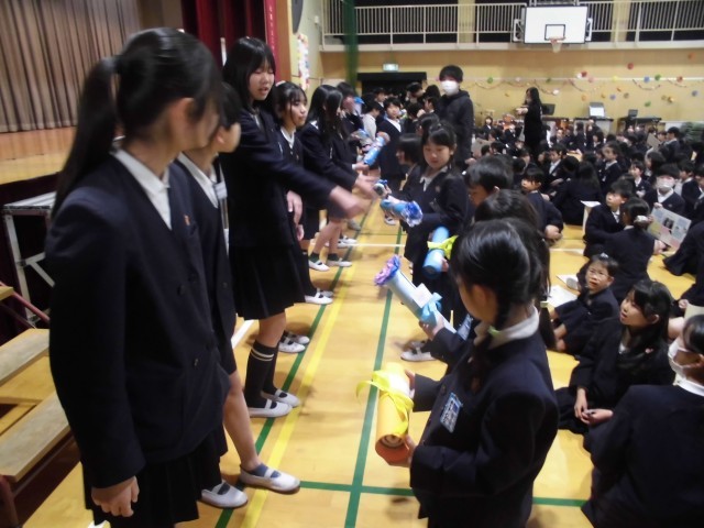 「卒業おめでとう集会」が実施されました。今日まで、6年生に感謝の気持ちを伝えようということで児童会を中心に準備を行ってきました。初めに6年生と最後の楽しい思い出を作るためにゲームをしました。ゲームの内容については、運営委員の児童が学級めぐりをして全校児童に意見を聞いてきて、代表委員会で話し合って決めました。50/50や6年生クイズを行い、みんなで盛り上がりました。続いて各クラスからのビデオメッセージです。各クラスごとに個性があって心のこもったメッセージが送られました。次に在校生からのプレゼントわたしと卒業生からのプレゼントわたしでした。6年生は、縦割り班で1年間一緒に活動した在校生からのメッセージを読み、とても喜んでいました。最後は、6年生からのメッセージと歌「カイト」でした。最後に6年生から全校児童にしっかりと聞かせる素晴らしい合唱でした。