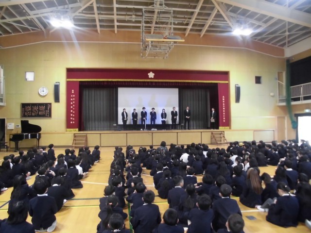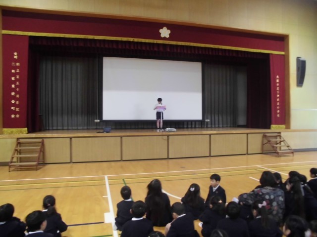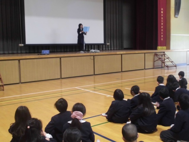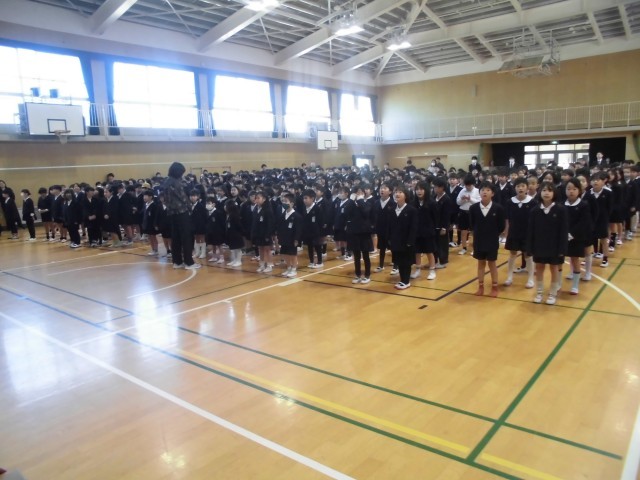 初めに転入生の紹介がありました。続いて他の学校に転任された教職員からのビデオレターをみんなで見ました。転任と聞いてさみしそうにしている子もいました。その後は、新しく来られた教職員の紹介とあいさつがありました。みんな興味津々で聞いていました。6年生の代表児童から新しく来られた教職員の方へ歓迎の言葉をしっかり伝えることができました。始業式では、6年生の代表児童から新しい学年を迎えての目標の発表がありました。最高学年としての意気込みをしっかり発表していました。校長からは、「一秒の言葉」の詩の紹介があり、言葉についてしっかり考えようという話をしました。また、挑戦しようという話や当たり前のことをしっかりやろうという話もしました。みんなしっかり聞いていました。最後は元気よく校歌を歌いました。