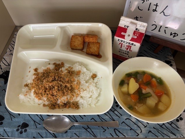 今日の給食は、「鶏肉とじゃがいもの煮もの」「あつあげのしょうゆだれかけ」「紅ざけそぼろ」「ごはん」「牛乳」でした。