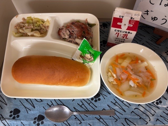 今日の給食は、「豚肉のガーリック焼き」「スープ」「ツナとキャベツのソテー」「コッペパン」「マーガリン」「牛乳」でした。