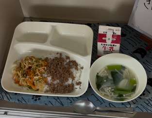 今日の給食は、「ビビンバ(肉・野菜)」「トック」「牛乳」でした。