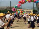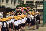 2年生が1年生に花の首飾りをプレゼントしました。花のアーチをくぐって退場しまし...