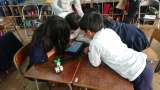 つくった扇風機をタブレットに繋ぎ、プログラムして動かします。