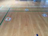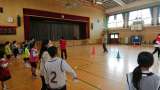 風船を使って、バレーボールをしました。6つのグループに分かれて、3つのコートを...