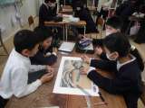 5年生が、図画工作で「神奈川沖波裏」の鑑賞をしました。まずは絵の中の頂点を見つ...