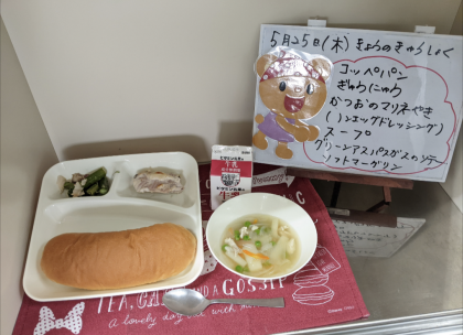 今日の給食は、コッペパン、牛乳、かつおのマリネ焼き【ノンエッグドレッシング】、ス...