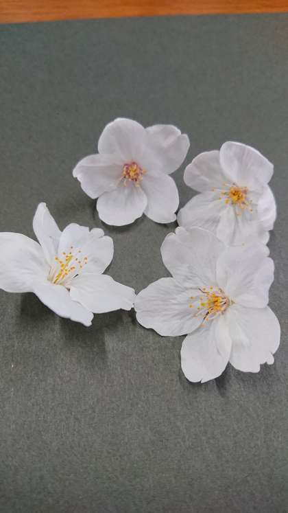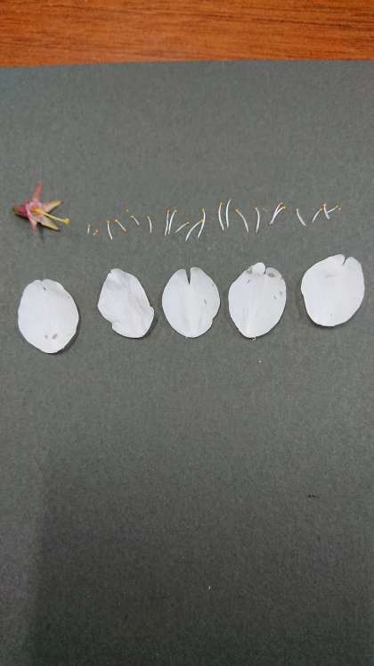 桜の花を調べてみました。花のつくりは、花びら、めしべ(がくと、くっついています)、おしべからできていました。ほかの花も同じなのでしょうか?