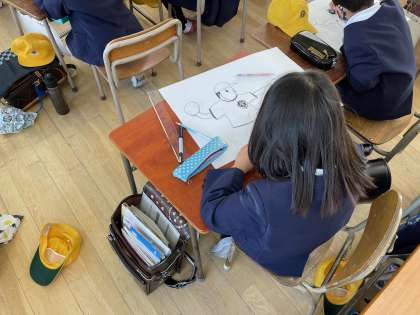 給食の時間を描いている子、友だちとドッジボールをしている様子を描いている子など1年間の思い出を振り返りながら描いています。