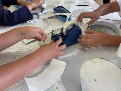 画用紙とビー玉を使って、セロテープを乗せている回転する皿を作りました。友達と相談をしながら、一人一人ちがうアイデアで工作をしていました。