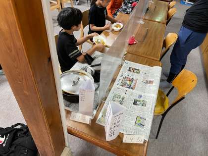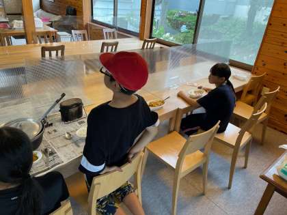 カレーが出来上がって食べています。自分達で作ったカレーはとても美味しいようです!