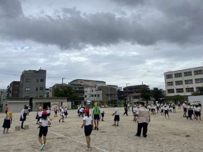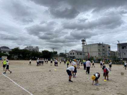 運動会の練習を安全に行うために、運動場の大きな石やとがった石を協力して拾いました。