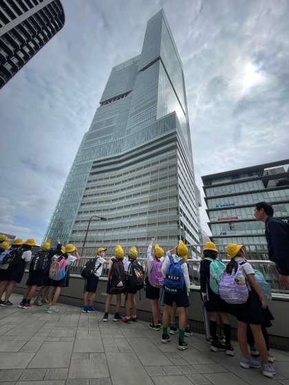 天王寺駅に着きました。ハルカスの大きさに驚いています。