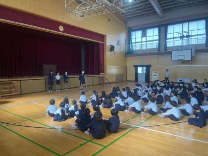 今日の集会は委員長発表でした。健康委員会、集会委員会、代表委員会、運動委員会の委員長が1年間で頑張りたいことを発表しました。
