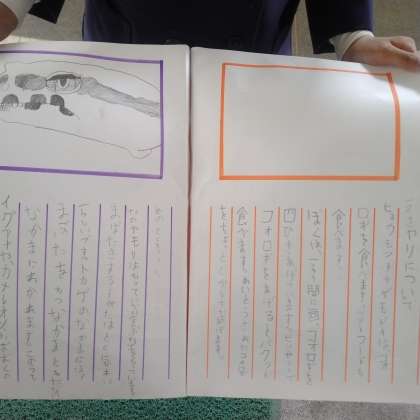 児童が作品を見せてくれました。トカゲについて書いてあります。