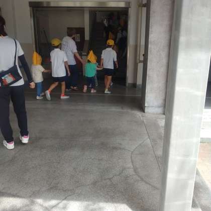 津波を想定してめぐみ保育園の子どもと4階まで避難します。