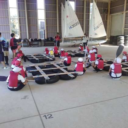 いかだの説明を聞いています。