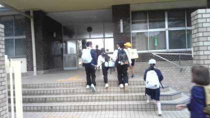登校風景です。3年生と4年生はリュックサックで登校です。