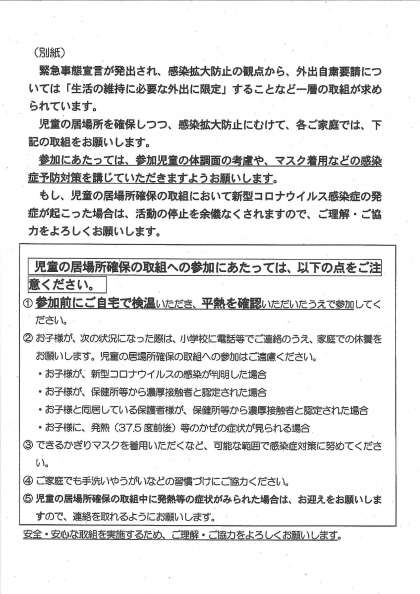 再開にあたって、安全面に関して配慮は致しますが、感染のリスクも懸念されます。ご家庭等でお子様の監護が可能な方は、必要最小限の日時でのご利用をお願いいたします。