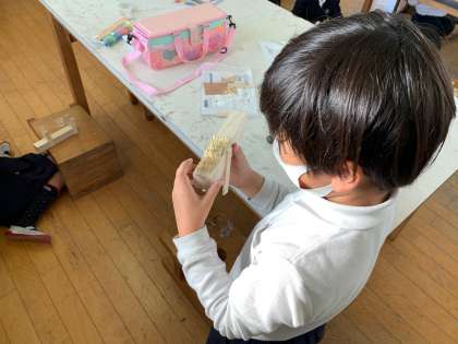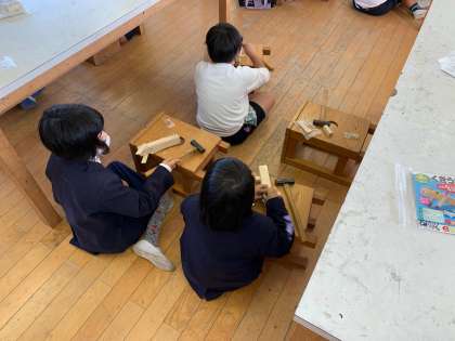 図工の「くぎうちトントン」の様子です。金づちを使って、木材にくぎを打ち付けています。くぎの打ち込む場所を工夫して模様にするなど、意欲的に取り組んでいました。