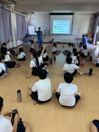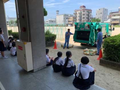 2時間目は、地球温暖化や海洋汚染など地球規模の環境問題や、3R(リデュース・リユース・リサイクル)についての話を聞き、3時間目は、パッカー車の見学や、ごみの種類ごとに分別をしました。