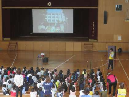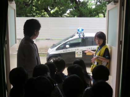 かわいいキャラクターの“ももてんちゃん”と“かぶ太子くん”の1日の様子を映像で見ながら、安全パトロールの方から、町の中にはどんな危険な場所があり、どんなことに気を付けなければいけないのか。また、どんなルールを守れば安全で安心な生活をおくることができるのか・・・たくさん教えていただきました。