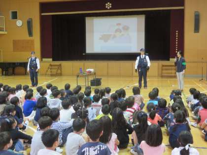 天王寺区役所の安全パトロールの方2名、天王寺警察署の方3名が来校し、1年生に「子ども安全教室」を行っていただきました。