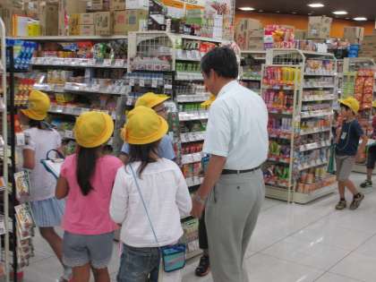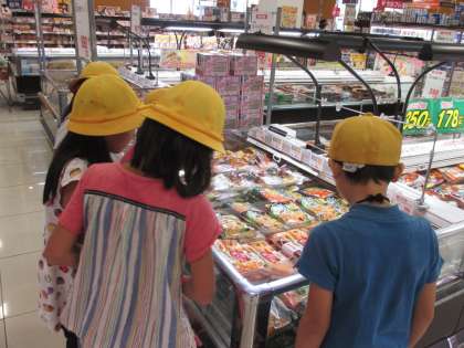 今日は社会見学で、校区にあるデイリーカナートイズミヤに行きました。まず、調理場や冷凍室などお店の裏側を見せていただきました。冷凍室の中に入れていただきましたが、とても冷えていて子どもたちはすぐに出てきていました。しっかり衛生管理をされていることを知りました。その後グループで売り場を回り、工夫して陳列されていることなどを学びました。最後に、お店の方に「あつかっている商品はどれくらいですか?」や「今一番売れている商品な何ですか?」などの質問をし答えていただきました。お店で働いている人の努力や工夫などていねいに教えていただきました。