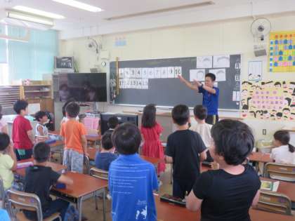 「数を表す言葉を知り、英語で数を数える」のめあてを確認したあと、