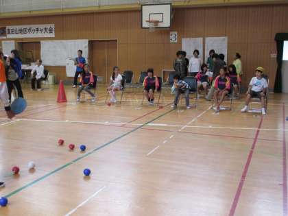 今日、本校の講堂で、第5回真田山地区ボッチャ大会が行われました。大会には地域の方とともに3年生の児童と真田山子ども会の児童が参加しました。