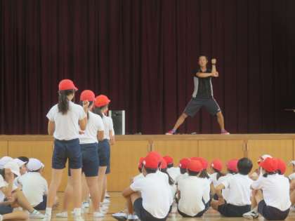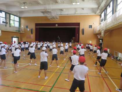 5年生は今日も講堂で運動会の練習をしました。列の前の子の動きを見て演技をするところがあり、まだまだぎこちなさが目立ちます。戸惑いながらもしっかり練習に励んでおり、運動会ではどれほど滑らかな動きになるのか楽しみです。