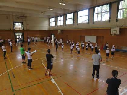 今日は1年生の体育の授業研究がありました。いつもと違って沢山の先生に見守られながらの授業に、こども達は少し緊張しているようでした。