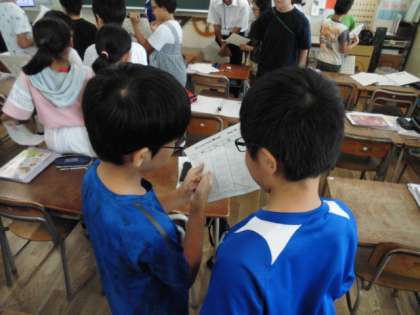 子供たちも授業の前半では、後ろに並ぶ先生方に緊張していたようですが、ペアでのやり取りがあり、近くの机どうし、教室を自由に歩いて交流するころには、緊張もほぐれたようで、楽しく英語の掛け合いを練習していました。