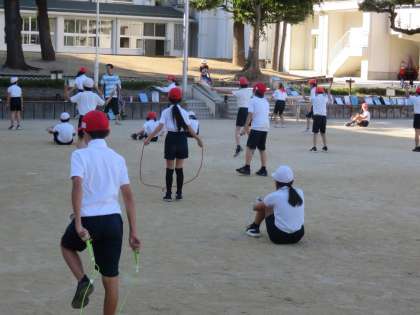4年生の体育では、走り高跳びと縄跳びに取り組んでいます。