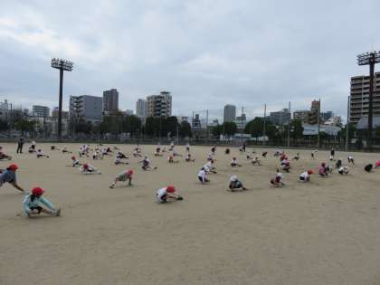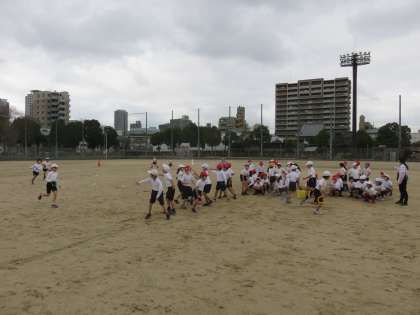 広いグランドで、鬼ごっことリレーをしました。子ども達はグランドを元気いっぱい走り回っていました。