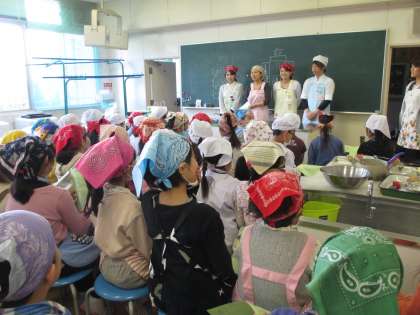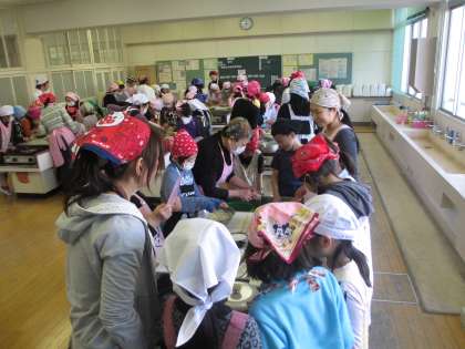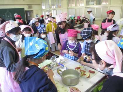 今日の放課後、「子どもクッキング」を行いました。地域の方々に教えていただきながら、「じゃがいものクリームスープ」「とうふのパンケーキ りんごのコンポート添え」を作りました。慣れない包丁を使ってがんばって調理をしている子ども、包丁の扱いをほめられ喜んでいる子ども、焼いているときのおいしそうな匂いに嬉しそうにする子ども、様々でした。 自分達で作った料理をおいしくいただきました。