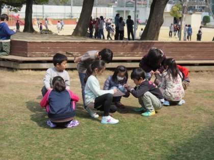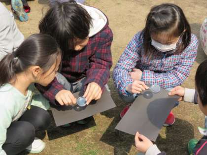 3年生が「光の性質」について学習しています。今日は、「虫めがねを使って日光を集めるとどうなるか」という学習をしました。黒い画用紙に虫めがねを上下左右に動かしながら日光を集めると、光が小さくなりとても明るくなったことにびっくりしていました。しばらくすると、一つのグループで小さな光から煙が出てきました。歓声が上がり、他のグループも必死になって光を集めていました。子どもたちは、光の明るさと焦げた紙の様子に集中していました。
