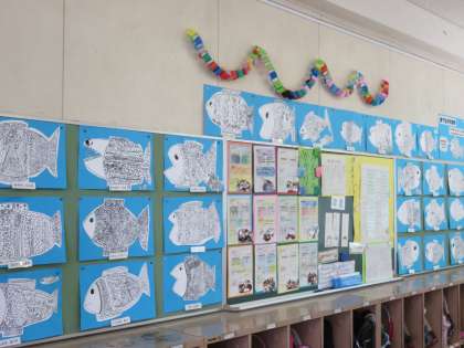 図工で「くるくるランド」を制作中です。ひとりひとりが2〜4つの場面を考えて、画用紙を切ったりはったりしながら楽しそうに活動をしていました。