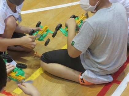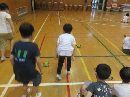 理科でプロペラを回して車を動かす実験をしました。プロペラは回す方向によって進み方が違います。子どもたちはめいいっぱいプロペラを回してゴムをねっじって、楽しく活動をしていました。