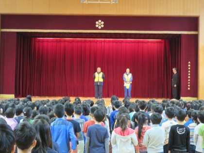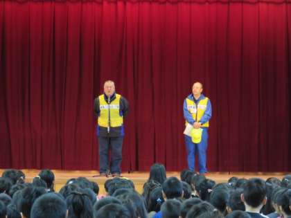 今日の児童朝会では、区役所の子ども安全パトロールの方が来校され、挨拶をしていただきました。黄色いベストと帽子が目印で、子ども達が安全に登下校できるように自転車や青色パトロールカーで見守ってくださっています。今年度もよろしくお願いします。【発信:教務 北風】