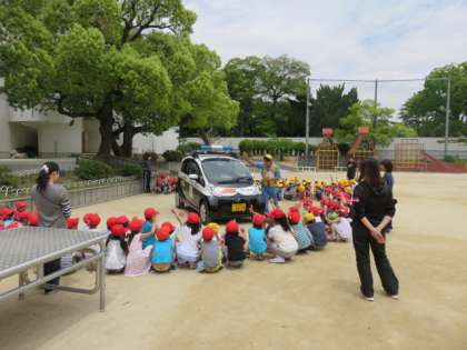 3時間目に、天王寺区役所の安全パトロールと天王寺警察署の方による子ども安全教室がありました。知らない人から「遊びに行こう」と誘われたら、大きな声を出したり、防犯ブザーを使ったり、大人の人や子ども110番の家に助けを求めたりすることや、信号や交差点での正しい渡り方、歩道の歩き方などを学び、最後に区役所安全パトロールカー(青パト)を見ました。子ども達は、安全に過ごせるように自分自身が気をつけなければいけないことをたくさん学ぶことができました。【発信:教務 北風】