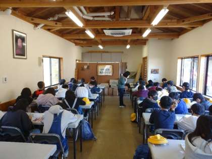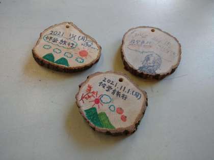 備長炭の原木、ウバメガシの木に絵を描いておみやげ作りをしました。修学旅行に関する絵を描いている子やただ好きな絵を描いている子など様々です。